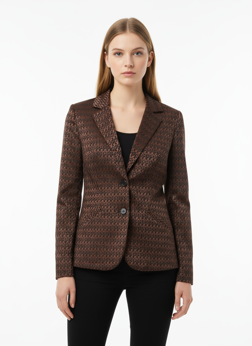 Ovaj elegantni sako u nijansama smeđe i crne boje ističe se profinjenim geometrijskim uzorkom. Izrađen od kvalitetnog materijala, pruža udobnost i klasičan chic izgled, savršen za poslovne prilike ili večernje izlaske.