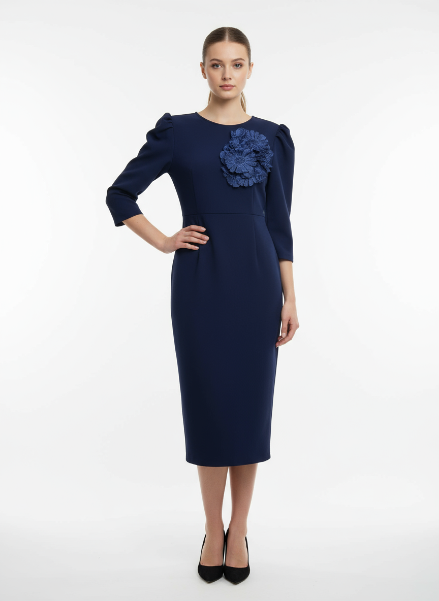Ova predivna tamnoplava midi haljina ističe se elegancijom i profinjenim detaljima. Izrađena je od glatkog materijala koji lijepo prati liniju tijela, a upotpunjena je upečatljivom 3D aplikacijom cvjetova u istoj boji na prednjem dijelu. Rukavi s blagim puf efektom i dužina do koljena daju joj sofisticiran i ženstven izgled pogodan za posebne prilike.