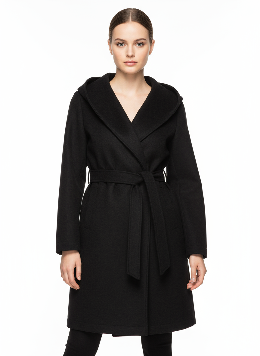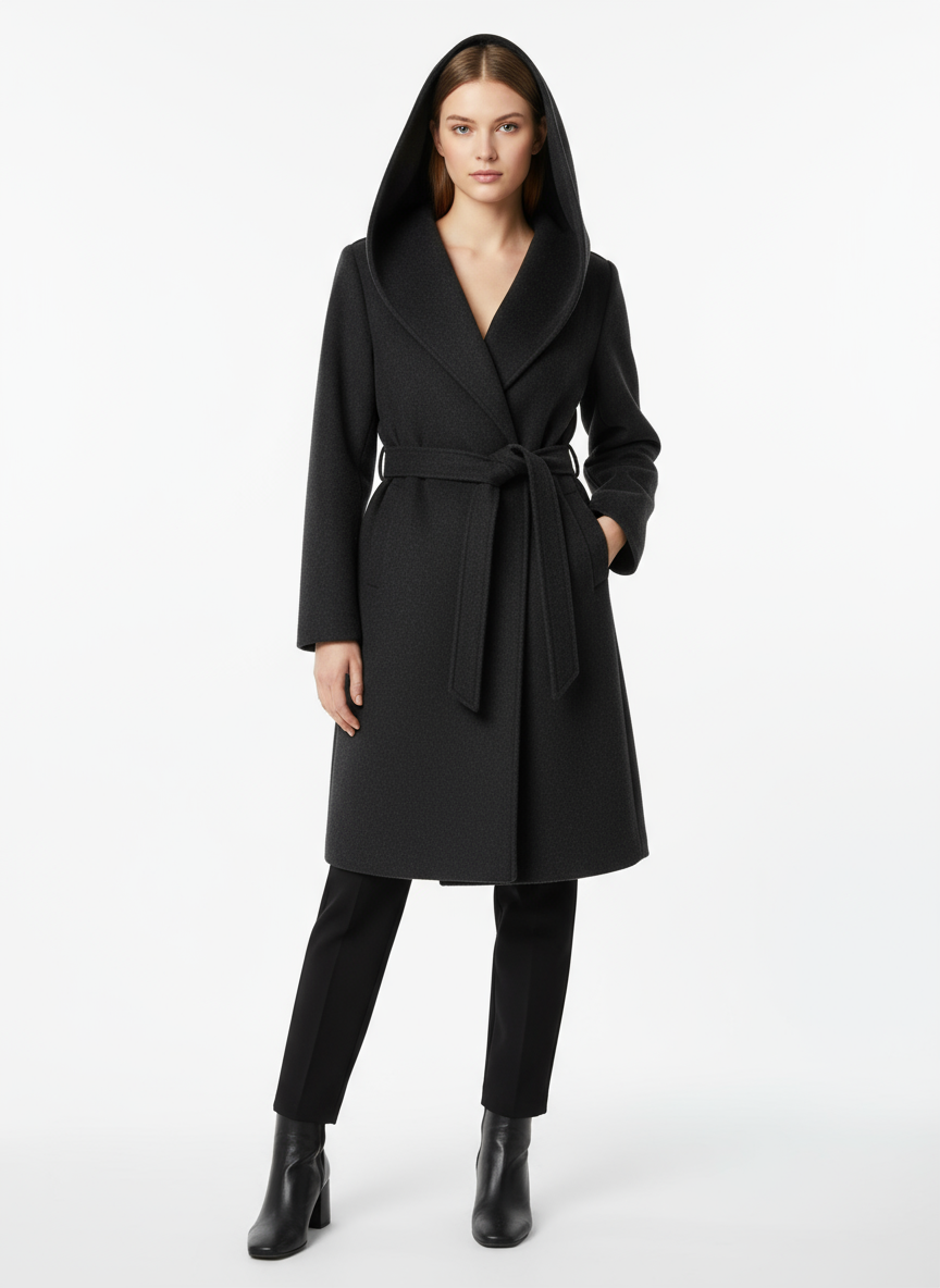 Elegantan kaput u antracit sivoj boji, izrađen od toplog materijala idealnog za hladnije dane. Širok kroj s otvorenim reverima i naglašenim pojasom osigurava sofisticiranu siluetu i udobnost.