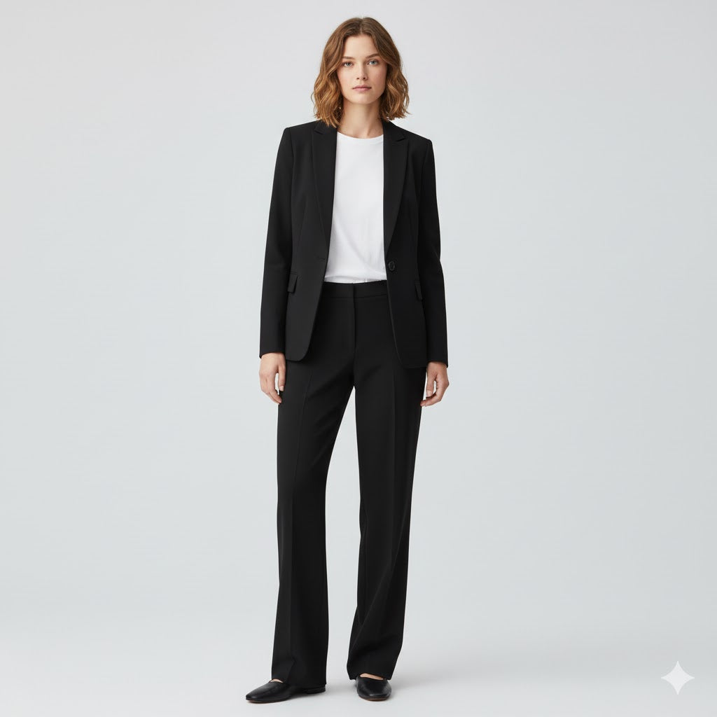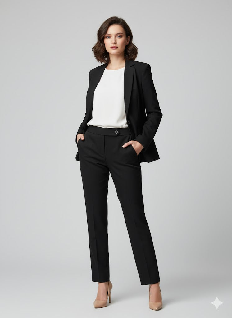 Moderno žensko odijelo koje spaja klasičnu eleganciju i suvremeni dizajn. Sastoji se od strukiranog sakoa i hlača ravnog kroja, stvarajući sofisticiranu i moćnu siluetu. Izrađeno od laganog i ugodnog materijala, pruža cjelodnevnu udobnost i besprijekoran stil. Bilo da se radi o važnom sastanku ili svečanom događaju, ovaj komplet je sinonim za samopouzdanje i uspjeh.