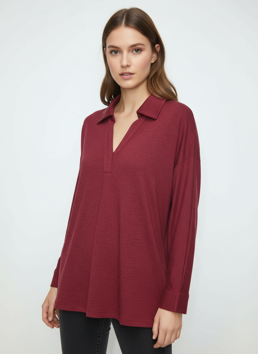 Moderna košulja-tunika u bogatoj tamnocrvenoj boji s blagim sjajem. Karakterizira je klasičan ovratnik i V-izrez, te opušteni kroj s dugim rukavima, idealna za udobnost i ležeran, ali sofisticiran izgled.