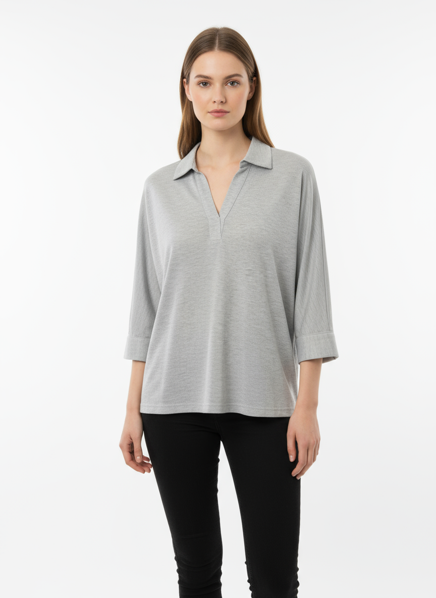 Udobna i elegantna siva polo majica s dugim rukavima i polo ovratnikom. Izrađena je od finog, prozračnog materijala koji osigurava udobnost tijekom cijelog dana, idealna za casual ili poslovne kombinacije.